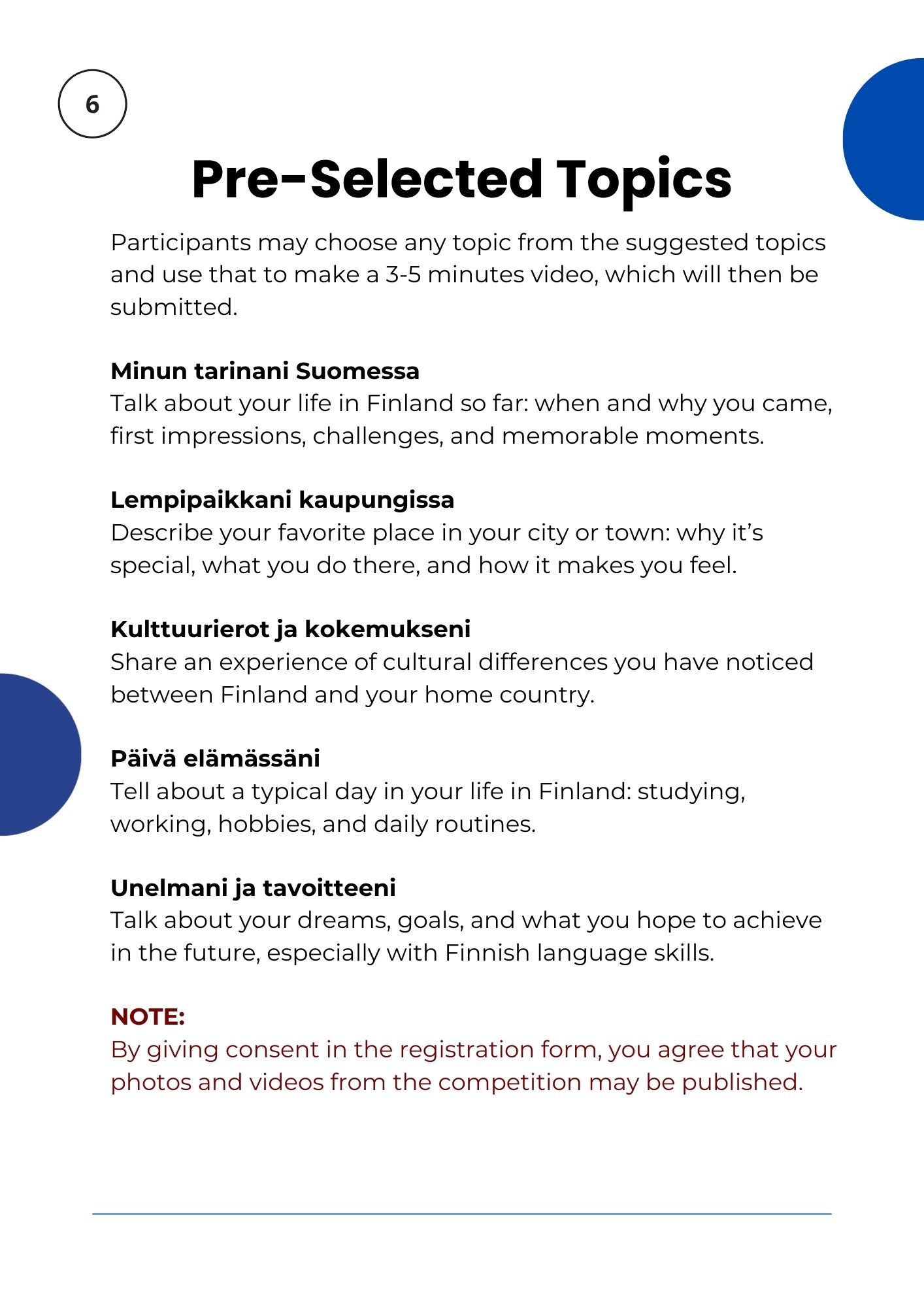 - 18.8.-14.9.2025 Ilmoittautuminen ja hakuvideoiden lähetys. Videolla hakija kertoo vapaasti annetusta aiheesta (Minun tarinani Suomessa, Lempipaikkani kaupungissa, Kulttuurierot ja kokemukseni, Päivä elämässäni tai Unelmani ja tavoitteeni). Videon pituus on max 5 minuuttia. Katso tarkemmat ohjeet ja aihevaihtoehdot täältä.