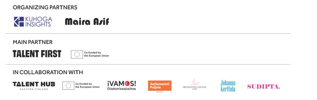 Mukana yhteistyötahot: Talent Hub Eastern Finland, Vamos Kuopio, Kompassi (Setlementti Puijola), Sudipta Chatterjee sekä Anastasiia Pietikäinen. Yhteistyökumppanit tarkentuvat syksyn aikana.